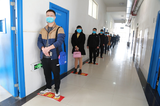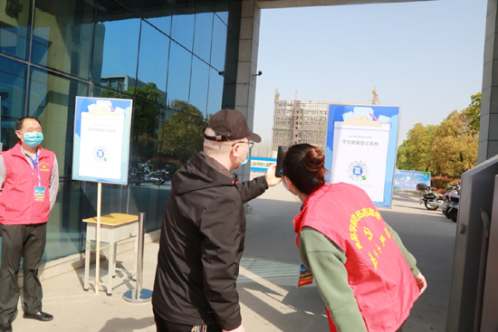 第一场景的演练上午9:30开始,志愿者在校门口组织学生有序排队,人与人之间相隔1.5米,逐一通过身份验证及健康码验证区、测温区、手足底及行李消毒区、扫码登记入校区,按照“一核二测三消四扫”的流程,确认无异常情况后学生方可进入校园。在测温期间如发现有学生体温等于或高于37.3摄氏度时,由学院医务人员将其带离测温队伍,在临时隔离室内进行腋下体温测量,在测温期间询问其返校交通工具、同程人员、近14天外出及人员接触等情况并进行登记。确定体温等于或高于37.3摄氏度后,由学院疫情防控发热送诊专用车将其送至市疫控办指定医院发热门诊。