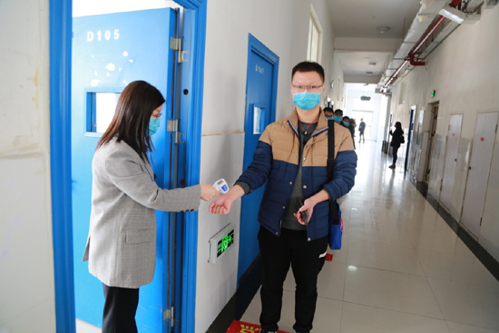 校门口临时隔离室医务人员对入校“发热”学生进行腋下测温
