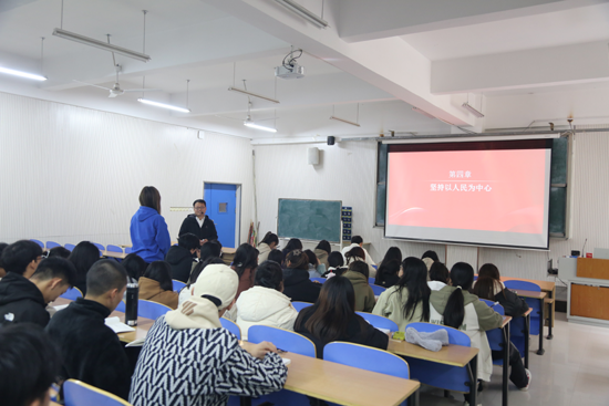 调研组采取“随机选择”“推门听课”的方式分别走进马克思主义学院付志浩老师《习近平新时代中国特色社会主义思想概论》课堂和张遵理老师的《思想道德与法治》课堂。