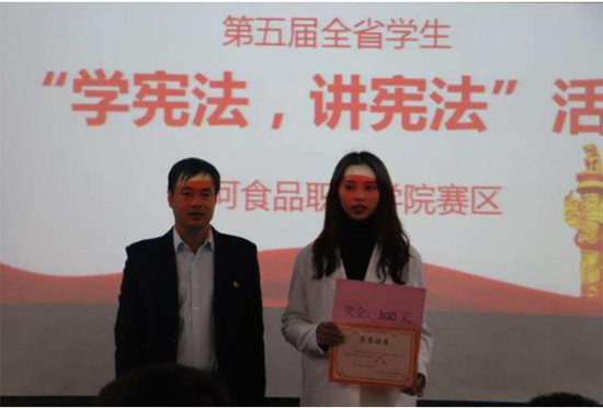 为深入贯彻落实习近平总书记关于宪法学习宣传教育的系列重要指示精神,贯彻落实党的十九大和十九届二中、三中、四中全会精神,进一步在青少年学生中普及宪法知识、弘扬宪法精神、树立宪法权威,引导青少年学生自觉成为宪法的忠实崇尚者、自觉遵守者、坚定捍卫者。2020年10月30日中午12:40,我院在E号楼一楼南多媒体举办了以“学宪法,讲宪法”为主题的演讲比赛。学院团委副书记于书记、信息工程系团总支书记李书记、经济管理系团总支书记刘书记、食品检查系团总支书记谢书记、团委社团管理部长陈老师、学生处老师陈老师、团委宣传委员赵老师出席本次活动,活动由共青团漯河食品职业学院委员会举办。