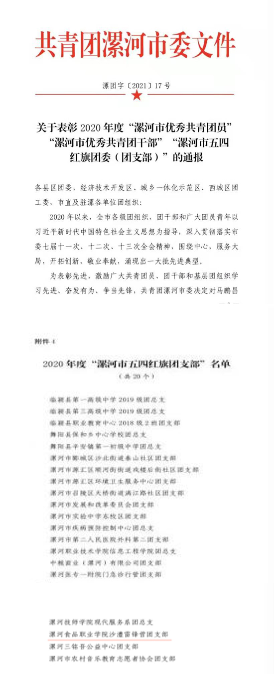 2021年4月22日,共青团漯河市委揭晓了2020年度“漯河市五四红旗团委(团支部)”名单,我校沙澧雷锋营团总支喜获该奖项!