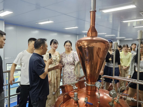大家亲眼见证了从原料入库到成品出库的每一个环节,深刻理解了产品产业链的复杂性和严谨性。在讲解的过程中,张俊峰经理也跟我们分享了中药、精油、纯露的提取流程。这种近距离的接触让他们对电商品牌的运营模式有了全新的认识,也为今后的教学工作提供了宝贵的实践案例。