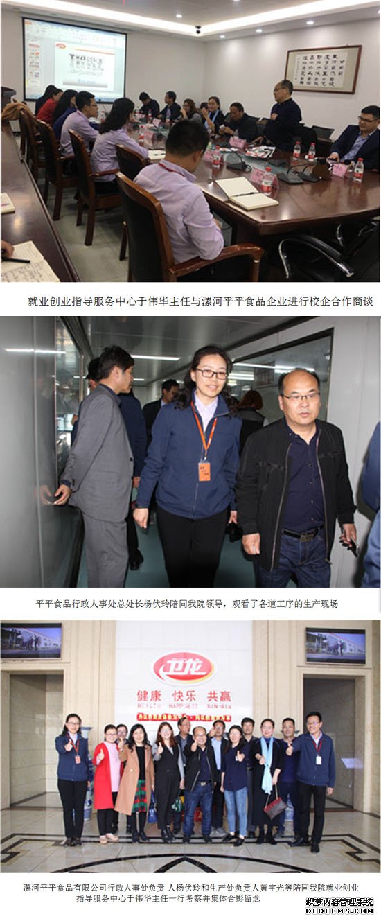 为贯彻落实高等职业教育改革理念,创新校企协同育人模式,进一步提高人才培养质量,实现校企共赢目标。3月27日下午,我院就业创业指导服务中心于伟华主任、院教务处魏新征副主任;食品工程系田呈瑞主任、唐雪燕主任;质检系唐红艳主任、质检系教研室王红会主任;经管系王潇主任,经管系教研室苏会侠主任 ;食品机系械系张仲欣主任、刘光辉副主任一行,莅临漯河平平食品有限公司开展校企合作参观考察。漯河平平食品行政人事总处长杨伏玲、生产处总处长黄宇光、人力资源中心潘丹丹主任、余萍主任及品控中心张小亚主任等陪同参观考察。