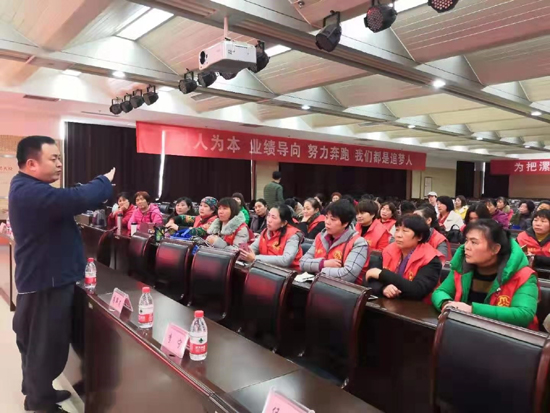 郾城区妇联主席李淑云讲话,并宣布2019年家政技能培训正式启动。仪式结束后,由漯河食品职业学院健康管理专业吕熠鹤为大家授课。