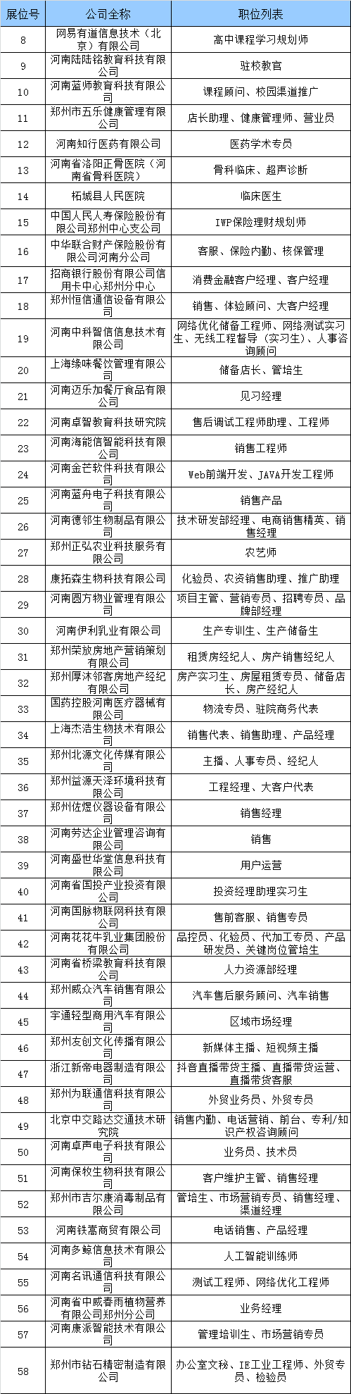 截至目前,柘城县人民医院、河南省洛阳正骨医院(河南省骨科医院)、河南省国投产业投资有限公司、国药控股河南医疗器械有限公司、河南伊利乳业有限公司、河南花花牛乳业集团股份有限公司、河南德邻生物制品有限公司、河南陆陆铭教育科技有限公司、网易有道信息技术(北京)有限公司等60余家国有企业、教育机构和医疗机构参会,提供岗位1600余个。用人单位持续报名中……