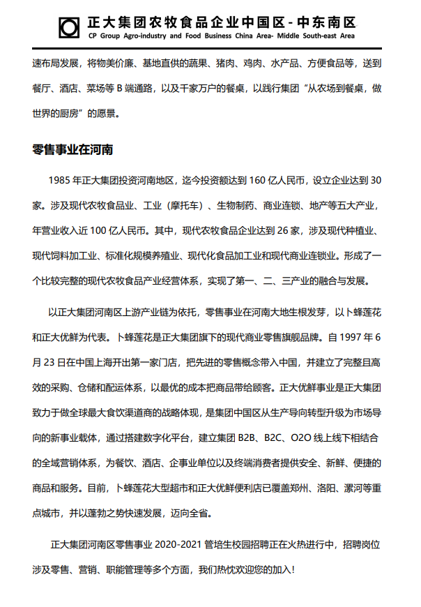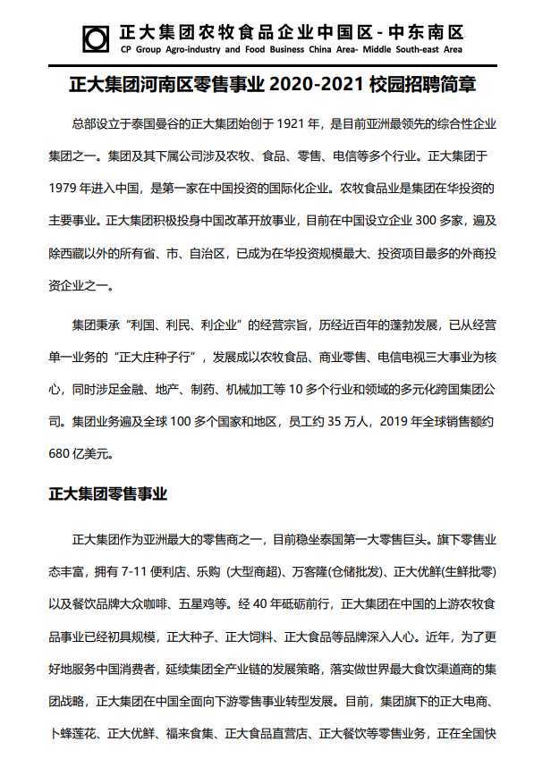 正大集团河南区零售事业2020-2021校园招聘简章