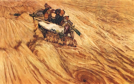 油画《在激流中前进》创作始于1962 年,完成于1963 年,历时两年。是画家杜键在油画研究班学习时的毕业创作。为此,杜键曾先后到山西禹门口、陕西宋家川等处在险急河段的黄河渡口体验生活,搜集创作素材。杜键以简练概括的艺术语言,雄健有力的笔触,沉着凝厚的色调,表现了船工们齐心协力搏击于黄河浊浪之中的惊险场景。