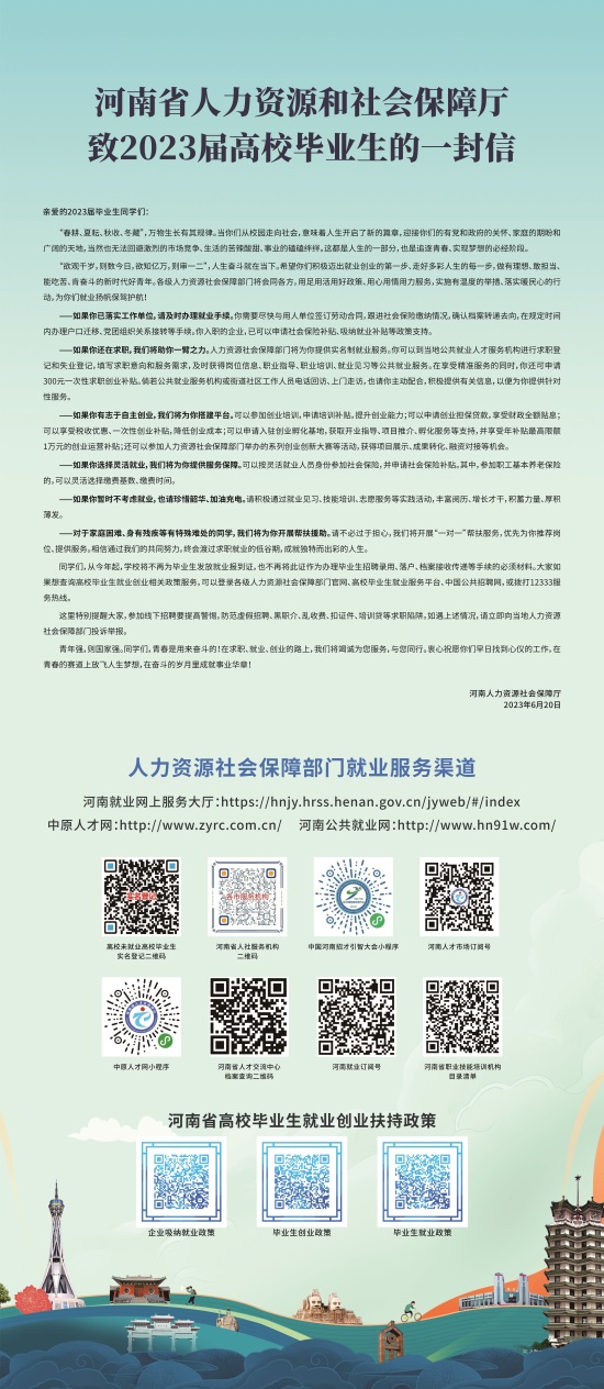 2023/08/03河南省人力资源和社会保障厅致2023届高校毕业生的一封信