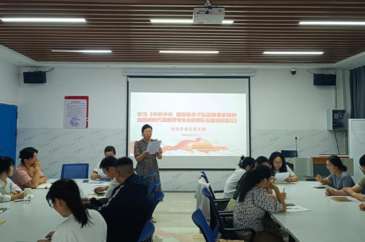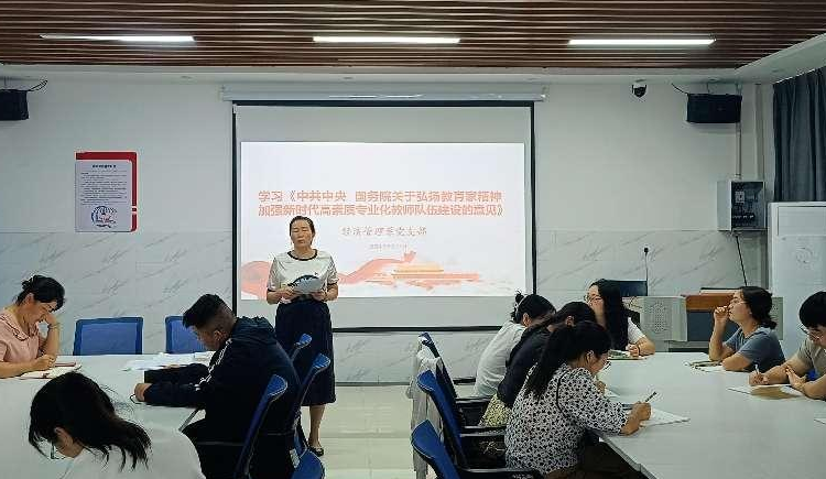 教师是立教之本、兴教之源,强国必先强教,强教必先强师。为大力弘扬教育家精神,加强新时代高素质专业化教师队伍建设,进一步营造尊师重教良好氛围,9月11日,漯河食品工程职业大学经济管理系党支部在M204召开“三会一课”及主题党日活动。党支部全体党员参加会议,会议由学院党支部书记丁超君主持。
