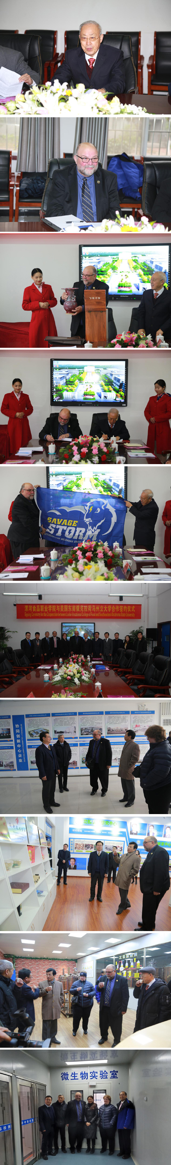 1月10日上午,漯河食品职业学院与美国东南俄克拉荷马州立大学合作签约仪式在我院新校区举行,美国东南俄克拉荷马州立大学校长BRYON KEITH CLARK、副校长TERESA GOLDEN、Ying chou Lin教授、Ning Wu教授、河南科技大学陈树兴博士、漯河食品职业学院院长赵国运、副院长高愿军、院长助理樊振江、院长外事助理董会庆、汽车工程系主任李参、经济管理系主任曹源参加签约仪式,仪式由院长外事助理董会庆主持并翻译。