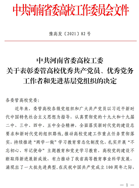 中共漯河食品职业学院经济管理系支部委员会,被授予“河南省高等学校先进基层党组织”荣誉称号!(详见:《中共河南省委高校工委关于表彰委管高校优秀共产党员、优秀党务工作者和先进基层党组织的决定》(豫高发〔2021〕82号)文件)... 阅读(1351)