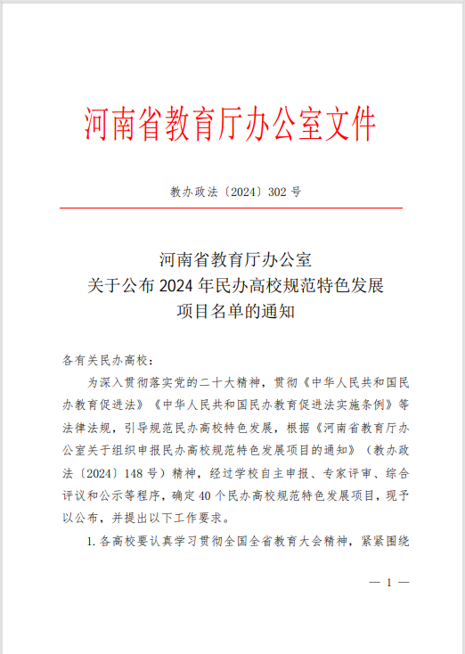 近日,根据《河南省教育厅办公室关于组织申报民办高校规范特色发展项目的通知》(教办政法〔2024〕148 号)精神,经过学校自主申报、专家评审、综合评议和公示等程序,确定 40 个民办高校规范特色发展项目。其中,学校《食品产业科技创新平台》评为2024 年全省民办高校规范特色发展项目。