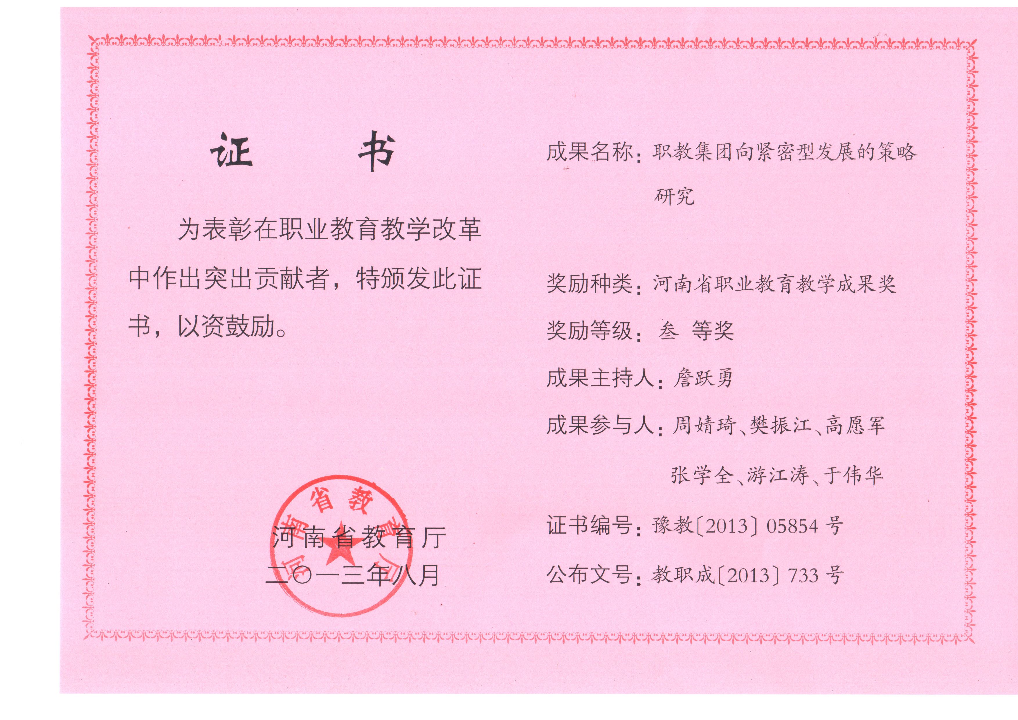 2013年9月8日,河南省食品职业教育集团“向紧密型发展的策略研究”荣获省教育厅三等奖。主持人为河南省食品职业教育集团理事长、漯河食品职业学院党委书记詹跃勇。