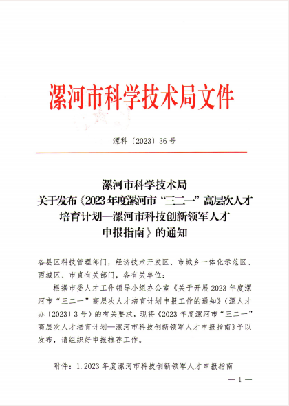 关于发布《2023年度漯河市“三二一高层次人才培育计划--漯河市科技创新领军人才申报指南》d的通知