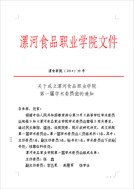 关于成立漯河食品职业学院第一届学术委员会的通知