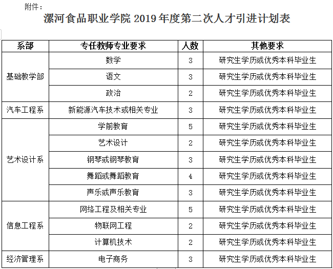 漯河食品职业学院是经河南省人民政府批准、国家教育部备案成立的全国唯一的食品类普通高等职业院校,主要为漯河中国食品名城和河南食品工业大省百亿食品产业培养急需的高素质技能型人才。学院是“全国职业教育先进单位”、“国家级重点职业院校”和“中央财政支持的职业教育实训基地”,已被教育部“十三五”规划列入河南省升本院校之一。为打造一支具有较高水平的高素质教师队伍并为升本储备人才,现开展2019年教师第二次招聘工作。