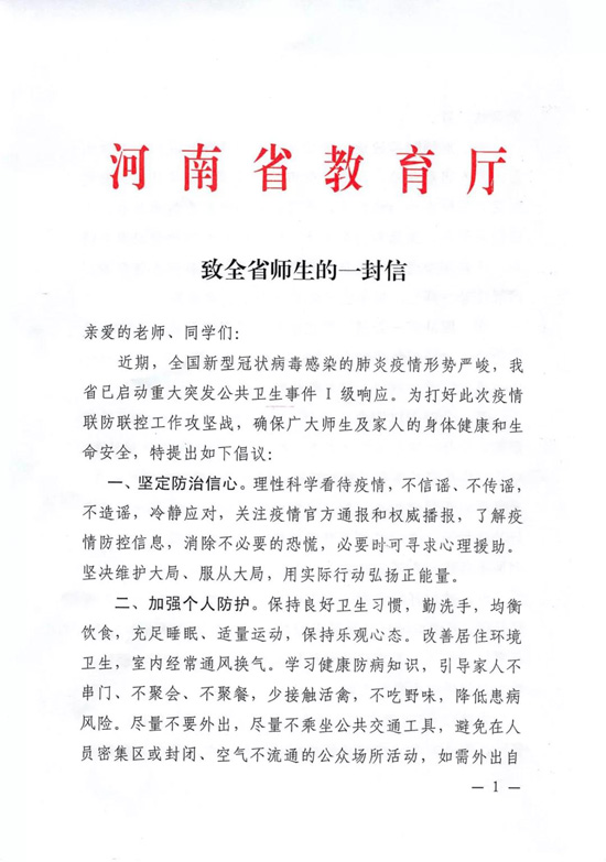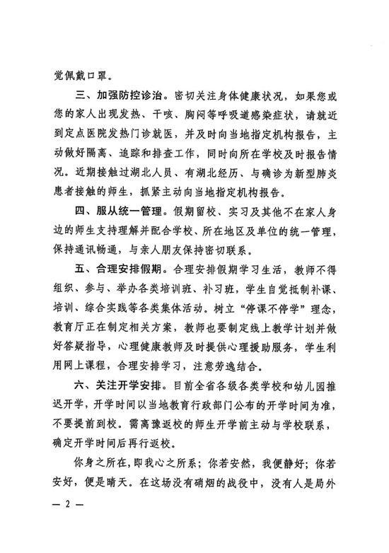 六、关注开学安排。目前全省各级各类学校和幼儿园推迟开学,开学时间以当地教育行政部门公布的开学时间为准,不要提前到校。需离豫返校的师生开学前主动与学校联系,确定开学时间后再行返校。