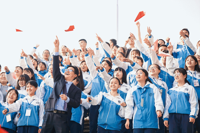 “教育首先是精神成长,其次才成为科学获知的一部分。”陈立群在台江民中从“心灵唤醒”和“精神教育”入手,改变苗乡孩子的精神面貌,为他们点燃梦想与希望。图为陈立群和学生一起举行“放飞梦想”活动。 新华社记者 谢希瑶/摄