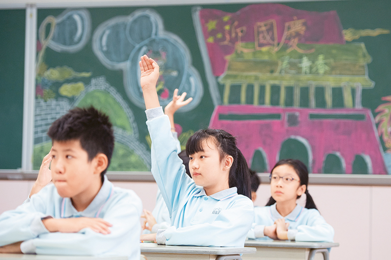 澳门中小学学生使用的教材《品德与公民》中有丰富的关于国情、国旗、国歌的内容,学生们可以从中学到很多关于祖国的知识,培养对祖国和澳门的感情。图为2019年11月25日,澳门濠江中学附属英才学校的学生在课堂上举手回答老师提问。 新华社记者 张金加/摄