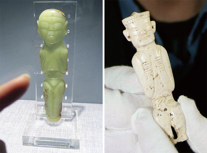 中华文明考古发现充分证明,文明因交流而多彩、因互鉴而丰富和发展。东北地区西部的红山文化高等级墓葬,和与其大体同时的安徽凌家滩遗址贵族墓葬,都出土了形制十分相近的玉人、玉龙、玉龟和玉鸟。左图为红山文化遗址出土的玉人,右图为安徽凌家滩遗址出土的玉人。 新华社记者 汪永基/摄