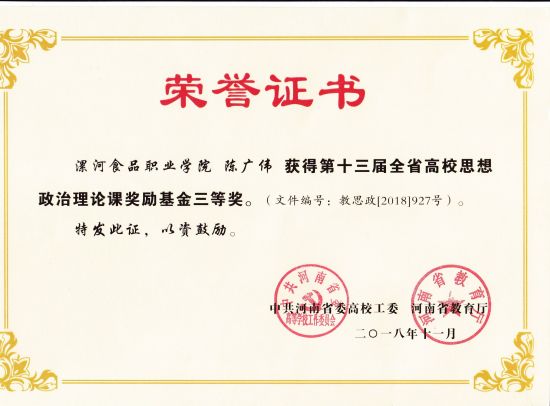 2018/10/25陈广伟老师荣获第十三届河南省高校思想政治理论课奖励基金
