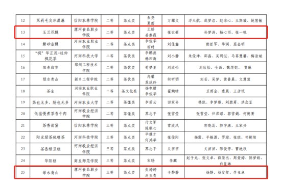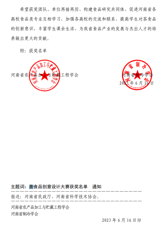近日,河南省农产品加工与贮藏工程学会发布了《关于公布河南省第一届大学生茶食品创意设计大赛获奖名单的通知》(会文〔2023〕8号)。食品工程系积极组织学生参加此次大赛,在大赛中荣获二等奖一项,三等奖三项,优秀组织单位奖一项。