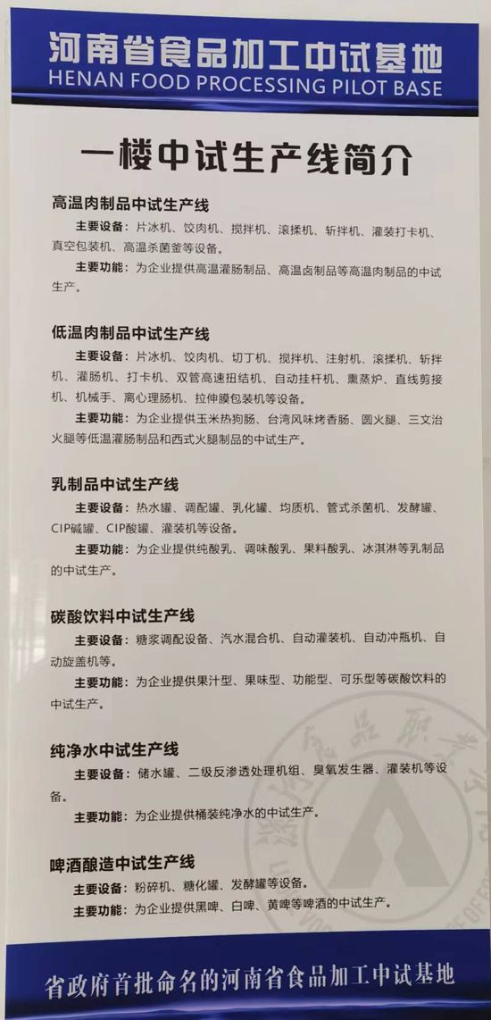 河南省食品加工中试基地为省政府首批命名的河南省8个中试基地之一,由漯河食品职业学院联合漯河经济技术开发区及其龙头企业共同建设,总投资2.1亿元,基础设施面积5万平方米,建设面积76700平方米,建有功能食品、新型食品、分析检测等6个研发中心及科研成果转化、孵化创业基地,目前拥有功能食品、肉制品、休闲食品等16条中试生产线,配置三重四级杆液质联用仪、气质联用仪、等离子体质谱仪ICPMS、高效液相色谱仪、气相色谱仪等大型检验检测仪器设备300余台(套)。