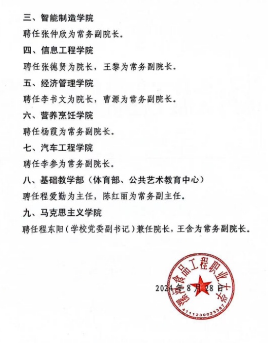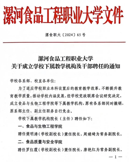 为了适应学校职业本科设置后的教育教学改革,不断提升教育教学质量,推动学校内涵发展,经学校党政联席会议研究决定,成立食品与生物工程学院。聘任樊明涛(学校副校长)兼任院长,周婧琦为常务副院长。
