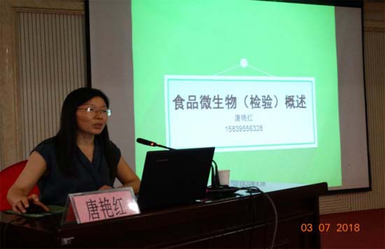 7月3日下午,食品营养与检测系主任唐艳红,应邀在漯河凯悦大酒店为参加“2018年河南省职业教育食品生物工艺专业‘双师型’教师培养培训”的140余名教师进行了两个半小时的培训。本次培训的主题是“食品微生物(检验)概述”。培训中唐主任用通俗易懂、诙谐幽默的语言向与会教师讲述了什么是微生物;微生物的特点;微生物在生活生产中的应用及食品微生物检验的一般流程。整场培训气氛活跃,掌声不断。会上,唐主任首先向与会教师讲述了微生物的概念,并以嗜热链球菌和乳酸链球菌为例讲述了微生物的五大特点,即体积小,面积大;吸收多,转化快;生长旺,繁殖快;适应强,易变易;种类多,分布广。接着,唐主任从乳酸菌的发现讲起,讲述了双歧杆菌对人体的保健功能及醋酸菌在食品工业中的应用,并以PPT的形式直观、详细地向教师们展示了该菌落的形态、特点,赢得了大家的阵阵掌声。