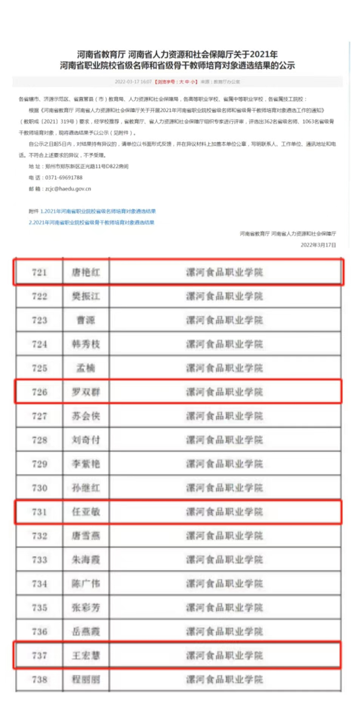 2022/03/18祝贺食品检测系四位老师被评选为“2021年河南省职业院校省级骨干教师培育对象”