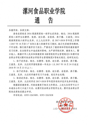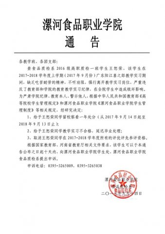 各教学班、各团支部: 查食品质检系2016级高职质检一班学生王恕荣,该学生在2017-2018学年度上学期(2017年9月份)广东阳江喜之郎教学实习期间,缺乏吃苦耐劳的精神,不听劝阻,强行... 阅读(606)