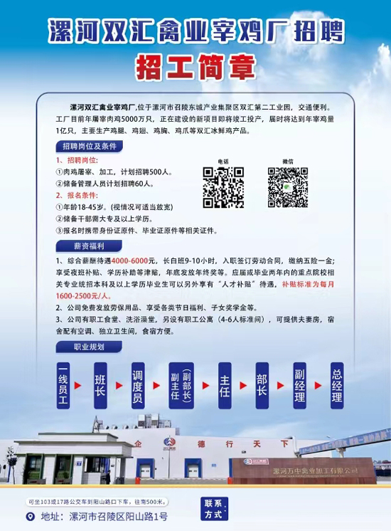 2023/12/18漯河双汇禽业宰鸡长招聘简章