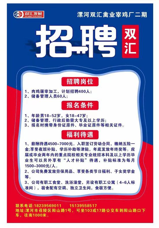 2023/12/18漯河市双汇禽业宰鸡长二期招聘信息