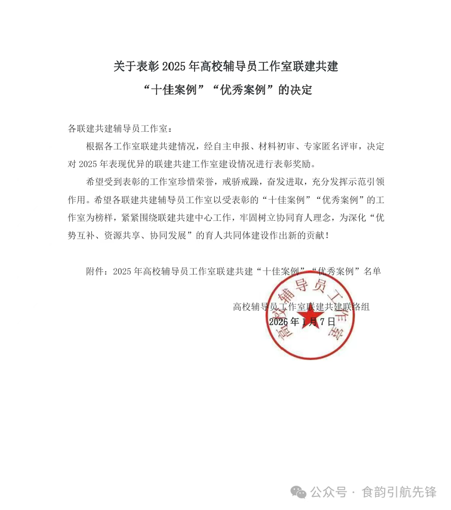 - 2026.01.12我校食韵引航辅导员工作室获评高校辅导员联建共建“优秀案例”