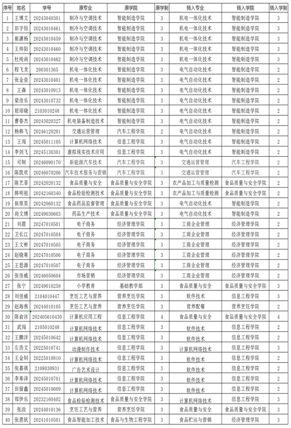 按照《漯河食品工程职业大学学籍管理规定》《漯河食品工程职业大学学生转专业规定》等文件要求,经学生个人申请,转出转入院部审核,学生处复核,报校领导同意,现将转专业...