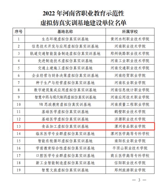 日前,河南省教育厅办公室下发《关于公布 2022 年河南省职业教育示范性虚拟仿真实训基地建设单位名单的通知》(教办职成〔2023〕198 号)。经学校自主申报、省教育厅组织专家进行综合评审、公示无异议环节,确定河南省职业教育示范性虚拟仿真实训基地 35 个。其中,漯河食品职业学院食品加工虚拟仿真实训基地上榜。学院将以示......
