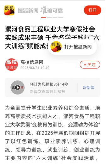 为深化“实践育人”综合改革,培养高素质技术技能人才,我校于2025年寒假期间组织开展了以“六大训练”为主要内容的社会实践活动,同时组织学生参加了河南省大学生社会实践项目,“探寻‘妈妈的味道’——河南民间传统特色美食制作工艺探访社会实践活动。这次社会实践活动内容丰富、参与面广、收效良好,受到了校外多家媒体的关注。近期,高校信息网和搜狐新闻对我校开展的“六大训练”寒假社会实践活动进行了报道。