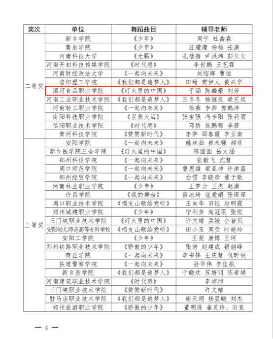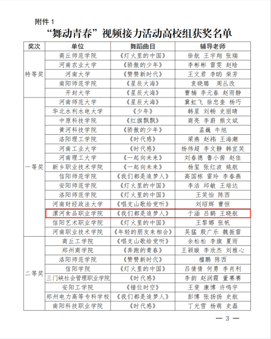 日前,中共河南省委教育工委办公室、河南省教育厅办公室下发了《关于公布“舞动青春”视频接力活动获奖结果的通知》(豫教工委办〔2022〕60号)文件。其中,由我院辅导老师于涵、 吕鹤、王晓航编排的舞蹈《我们都是追梦人》荣获一等奖, 于涵、陈麟豪、刘芳编排的舞蹈《灯火里的中国》荣获二等奖。