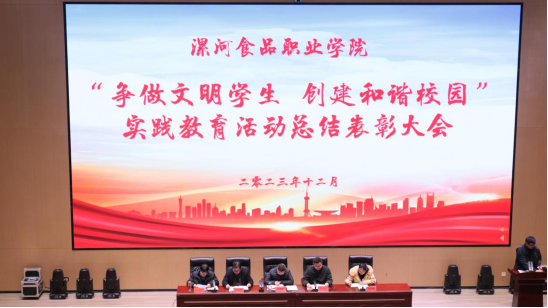 2023年12月28日下午,我院在图书信息中心第一学术报告厅召开了“争做文明学生 创建和谐校园”实践教育活动总结暨表彰大会。学院副院长冯建业,学院党委委员、党委学生工作部部长侯保清、学生处副处长兼食品机械系党支部书记曹学源、学生处副处长邵换峥、校团委副书记于金辉、各系部党支部书记、团总支书记、辅导员及学生代表参加了会议。