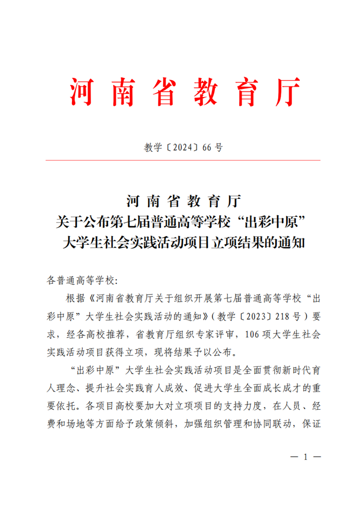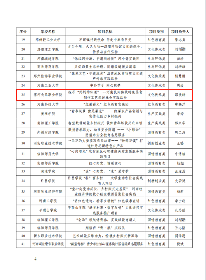 近日,河南省教育厅下发《关于公布第七届普通高等学校“出彩中原”大学生社会实践活动项目立项结果的通知》(教学〔2024〕66 号),经各高校推荐,省教育厅组织专家评审,106 项大学生社会实践活动项目获得立项,其中,由漯河食品职业学院教师邵换峥负责的《探寻“妈妈的味道”--河南民间传统特色美食制作工艺探访社会实践活动》获批立项。