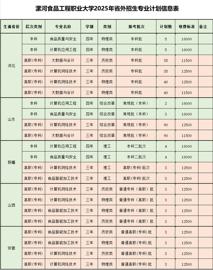漯河食品工程职业大学2025年省外招生专业计划信息表