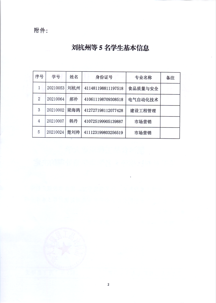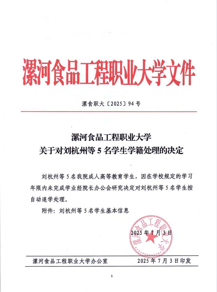 漯河食品工程职业大学关于对刘杭州等5名学生学籍处理的决定