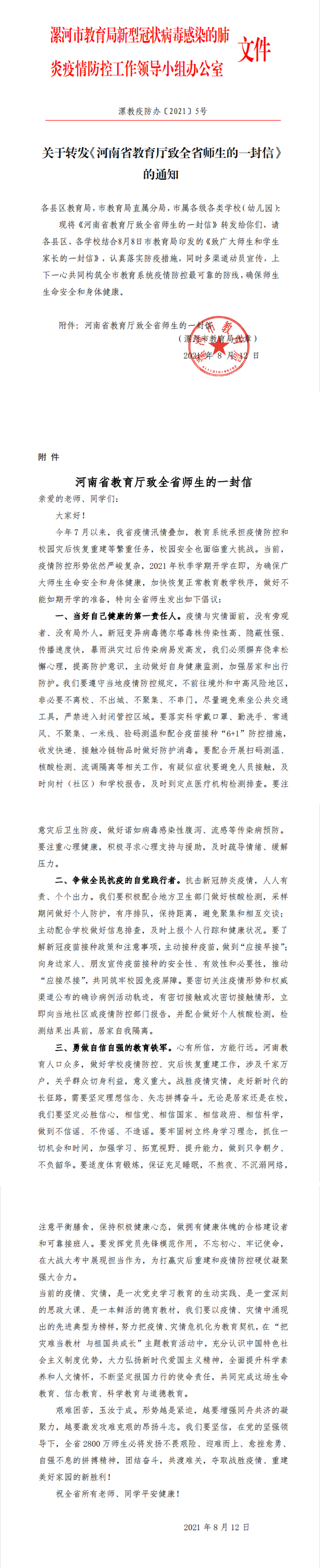关于转发《河南省教育厅致全省师生的一封信》的通知