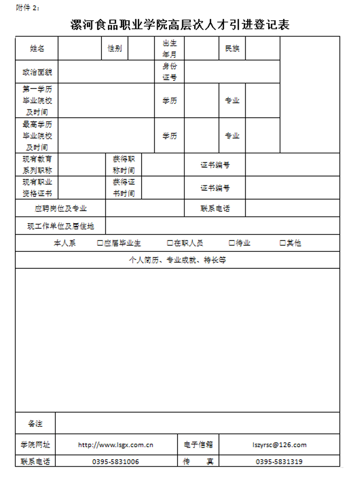 报名办法:请将个人简历电子稿、《漯河食品职业学院高层次人才引进登记表》(附件2)及相关证书(本人身份证、户口本、毕业证书、学位证书等)扫描件发送至学院人事处邮箱(lszyrsc@126.com)。邮件主题请标明“应聘岗位+姓名+毕业学校+学历+专业”。