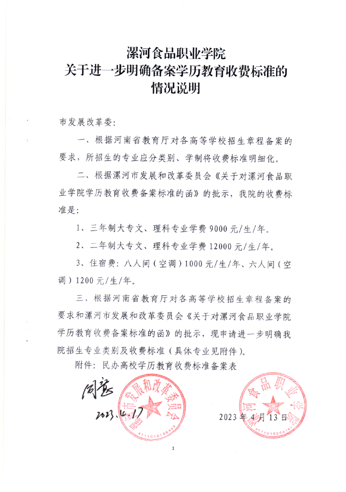 漯河食品职业学院关于进一步明确备案学历教育收费标准的情况说明