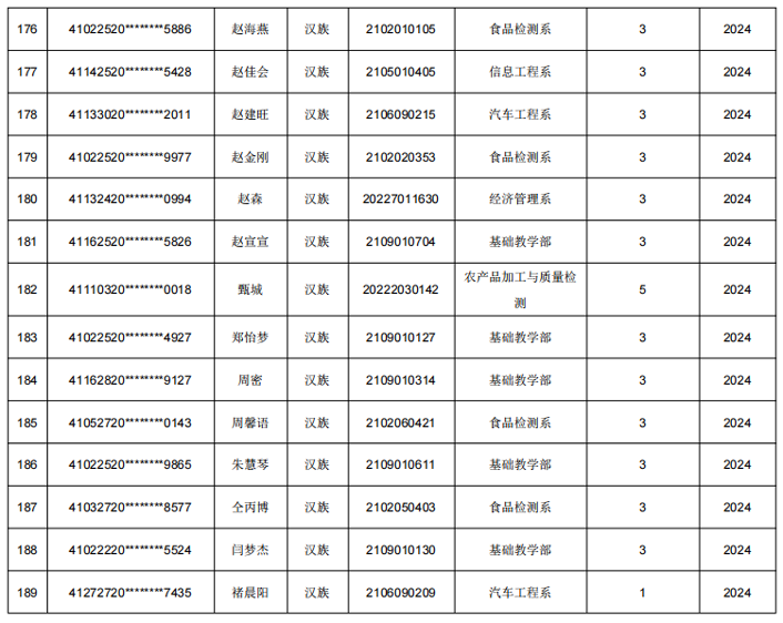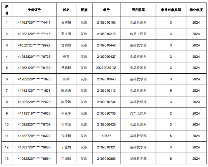 我院2024届高职毕业生求职补贴申请工作已开始,根据豫人社函〔2023〕133号《2023年高校毕业生困难求职创业补贴通知》文件精神,现将初审符合条件的189位享受城乡居民最低生活保障家庭、本人残疾、国家助学贷款、建档立卡脱贫家庭和监测对象家庭、脱贫残疾人家庭和监测对象残疾人家庭和特困人员的学生基本情况公示如下:
