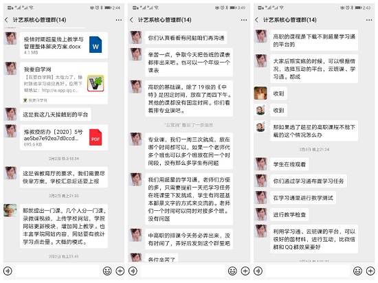 接到通知后,系主任王黎迅速召开在线会议,明确责任,系班子成员齐心协力,敢于担当,主动作为,迅速讨论线上学习方案,组建“停课不停学教学群”,并结合各专业学生特点,制订出《信息工程系疫情防控期间网络教学方案》和《信息工程系计算机专业线上辅导时间安排》等方案,面向全体教师和学生进行转发,要求广大教师学生立即行动起来,居家工作学习,投入到网上教学和学习之中。