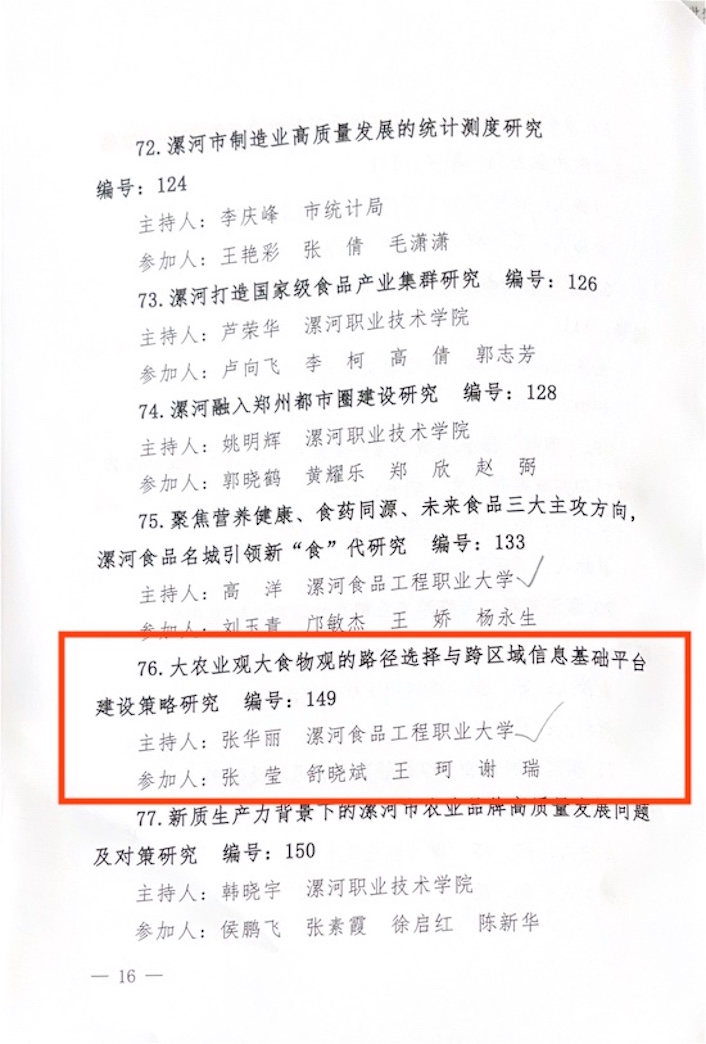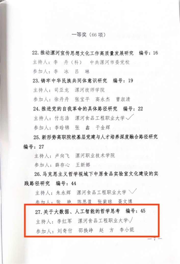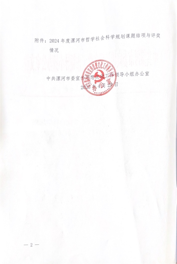近日,中共漯河市委宣传思想文化工作领导小组办公室下发《关于2024年度漯河市哲学社会科学规划课题结项与评奖情况的通报》(漯宣思文办〔2025〕2号)。经中共漯河市委宣传思想文化工作领导小组组织专家评审组评审环节,评审出特等奖21项、一等奖66项、二等奖94项、三等奖136项。