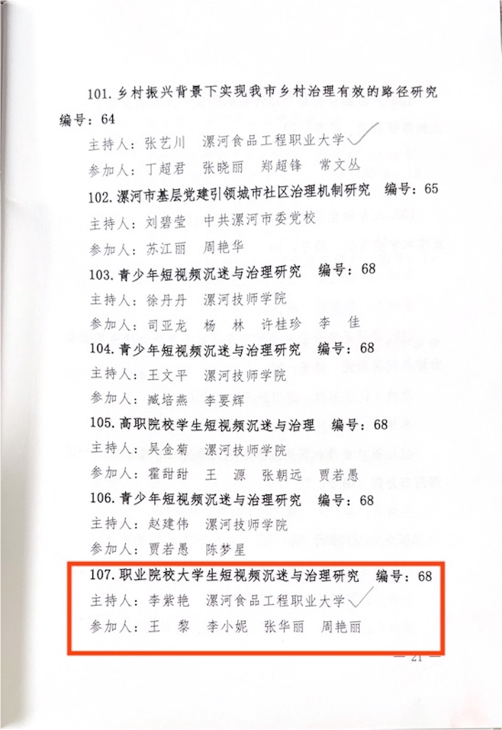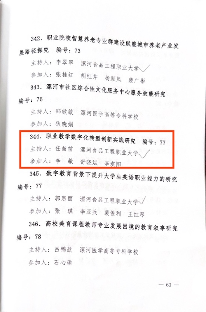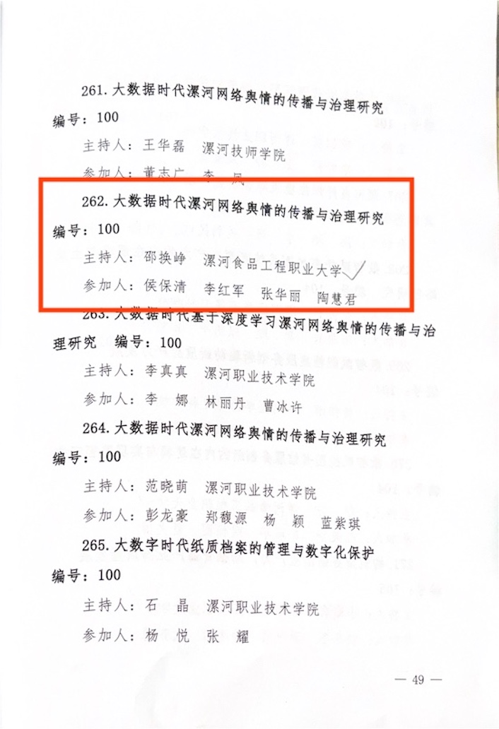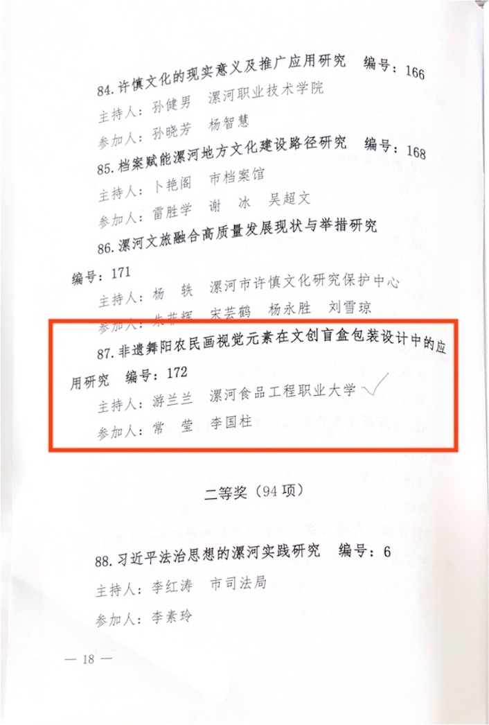 信息工程学院李红军老师主持课题《关于大数据、人工智能的哲学思考》(编号:45)、张华丽老师主持课题《大农业观大食物观的路径选择与跨区域信息基础平台建设策略研究》项目(编号:149)、张江博老师主持课题《河南省非物质文化遗产传承创新研究》项目(编号:160)、游兰兰老师主持课题《非遗舞阳农民画视觉元素在文创盲盒包装设计中的应用研究》项目(编号:172)荣获一等奖;李紫艳老师主持课题《职业院校大学生短视频沉迷与治理研究》项目(编号:68)、张佩瑶老师主持课题《漯河城市社区综合养老服务设施设计研究》项目(编号:72)荣获二等奖;李敏老师主持课题《“职普融通”与促进完善现代职业教育体系建设研究》(编号:81)、邵换峥老师主持课题《大数据时代漯河网络舆情的传播与治理研究》(编号:100)、刘依然老师主持课题《美育浸润视角下贾湖文化融入高职艺术设计教学研究》(编号:167)、吴霞老师主持课题《漯河红色文化融入包装设计课程思政路径研究》(编号:170)、李丹老师主持课题《漯河推进文旅融合高质量发展背景下的旅游商品包装设计研究》(编号:171)、任苗苗老师主持课题《职业教学数字化转型创新实践研究》(编号:77)荣获三等奖。十二位教师此次获奖,不仅是对其个人专业技术能力的高度肯定,更是信息工程学院深耕信息技术领域研究、赋能区域数字经济发展的生动体现。