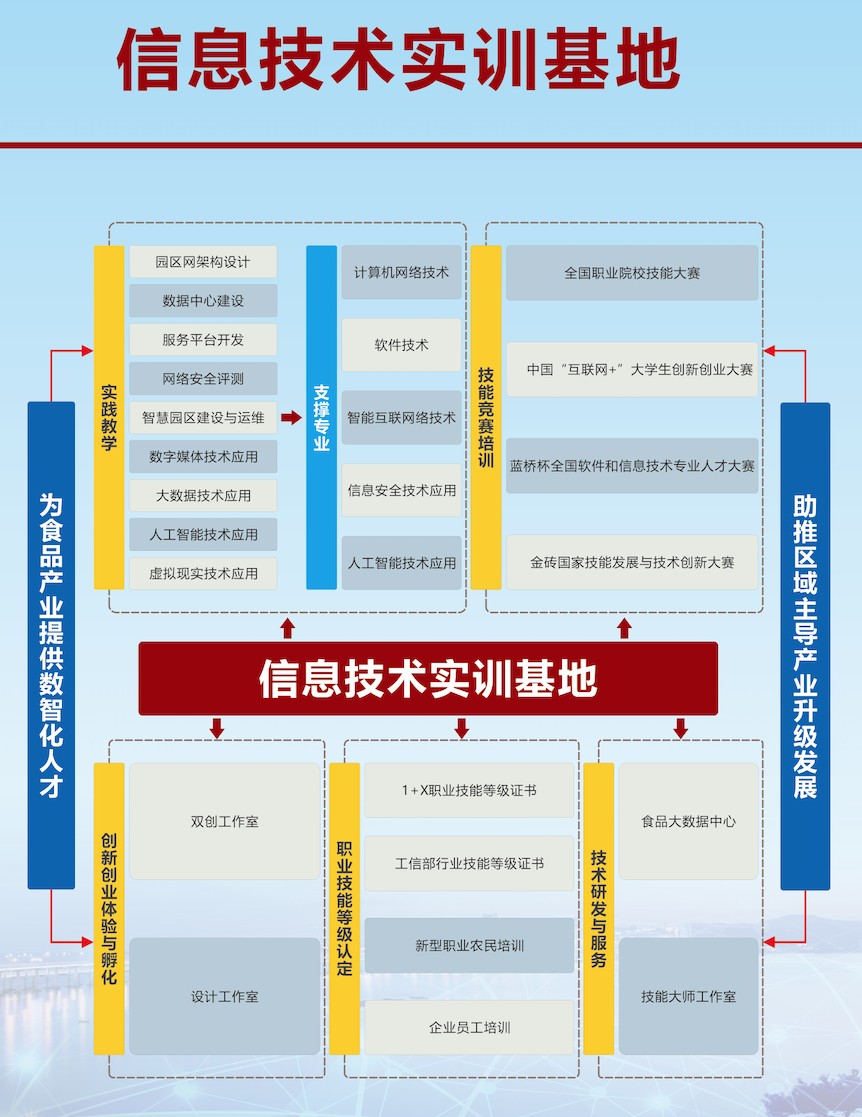 信息技术实训基地是国家级高技能人才培养培训基地,总面积4620平方,各类实训设备2577台套,学生专业实训工位2154个,设备总价值1561万元。 基地积极推进 “产学研转创” 融合发展,与多家企业共同创建了能够满足园区网架构设计、数据中心建设、服务平台开发、网络安全测评、智慧园区建设与运维、数字...... 阅读(1249)